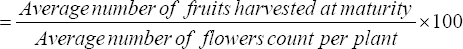 The number of days to bud formation, days to flowering (complete opening of flowers), and days to maturity were counted as a number of days from the date of planting. The floral buds and flowers present on each plant were counted after 20 days, 40 days, 55 days, 70 days, and 90 days of planting whereas the fruit count was done at the time of each harvesting and the total number of fruits per plant was estimated as the sum of each harvesting. The average number of buds, average number of flowers, and average number of fruits (berry) were estimated after dividing the total buds, flowers, and fruits count by the number of plants taken under observation in each replication. The fruit set percent was estimated using the formula given herewith.