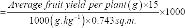 Fruit harvesting was done manually at 5–6 days intervals. The weight of 10 randomly selected fruits from each plot was measured using electronic balance and the average berry weight was estimated and presented in grams (g). The fruit volume was measured in cc (cubic centimeter or mL) using a measuring cylinder. The total fruit weight of harvested fruits from all the plants was divided by a number of plants in treatment to observe the average yield of fruit (berry) in grams per plant. The average fruit weight per plant was used to calculate the fruit yield from 1000 sq. m. of vertical farming system using the given formula and the estimated yield was expressed in kg per 1000 sq.m. (there were 15 plants in the experimental area [0.743 sq.m.] of vertical rack).