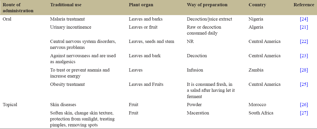 | Obesity treatment | Leaves and Fruits | It is consumed fresh, in a salad after having let it ferment | Central America | [25] | |