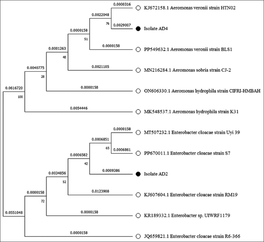 Bacterial isolates (AD2 and AD4) were also subjected to 16S rRNA gene sequencing for molecular-based identification of bacteria. Bacterial isolate AD2 showed 99.17%, while AD4 showed 98.48% similarity in NCBI databases when compared using the BLAST. These results confirmed that AD2 and AD4 bacterial isolates belong to the genera Enterobacter and Aeromonas, respectively. The 16S rRNA gene nucleotide sequences from AD2 and AD4 were submitted in the NCBI’s GenBank database with the accession numbers OR361741 and OR226595, respectively [Table 3]. The phylogenetic tree of isolates AD2 and AD4 was generated using gene sequences in MEGA 11.0 by the maximum likelihood method, as shown in Figure 1.