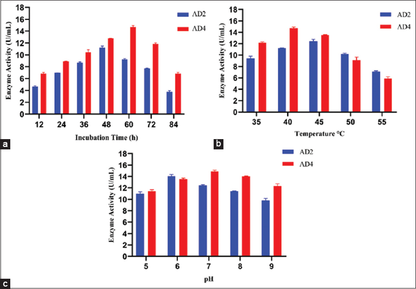 Optimizing the incubation time is crucial for achieving optimum amylase production. E. cloacae produced maximum enzyme at 48 h, while A. veronii produced it at 60 h [Figure 2a]. After optimum incubation time, enzyme production declined substantially, likely due to microorganism cell death, nutrient fatigue, and byproduct accumulation in the cultivated medium. In addition, the cells exhibited decreased amylase enzyme biosynthesis during the decline phase of growth [48]. These varying incubation periods reveal differences in each isolate’s growth and enzymatic activity patterns, highlighting the need to optimize incubation times to achieve desired results. A similar kind of observation was also reported by Yassin et al. [1]; maximum amylase production from Bacillus spp. strain M8 was observed at 48 h of incubation, and Bacillus spp. strain M2 was observed at 60 h of incubation. In another study, maximum amylase production by B. subtilis MTCC 121 was achieved after 48 h of incubation [49].