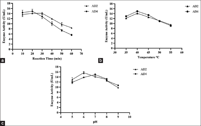 Bacterial isolates were initially identified using colony morphology and the Gram-staining method. The morphology of the isolates was identified using the Gram-staining test [Supplementary Figure 2]. Isolate AD2 was found to be Gram-negative short rods, arranged individually or in pairs, as observed under a microscope in an oil immersion lens. Isolate AD4 was found to be rod-shaped, non-spore-forming, Gram-negative bacteria under the microscope. Isolate AD2 showed a positive test for indole production, catalase test, and citrate utilization, whereas it was negative for the oxidase test. On the other hand, AD4 showed positive results for methyl red, the Voges-Proskauer test, and indole production while being found to be negative for oxidase and H2S production. The bacterial isolates AD2 and AD4 were identified as Enterobacter spp. and Aeromonas spp., respectively, based on both biochemical and morphological traits when compared to the Bergey’s Manual of Systematic Bacteriology [26]. Cultural characteristics and biochemical characteristics of amylolytic isolates are shown in Table 2.