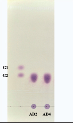| Figure 4: Analysis by thin layer chromatography of the hydrolysis products by the amylase produced by Enterobacter cloacae FZAD and Aeromonas veronii FZD. G1- Glucose; G2- Maltose; the mobile phase of n-butanol/ethanol/water in the ratio of 5:3:2 was used. [Click here to view] |