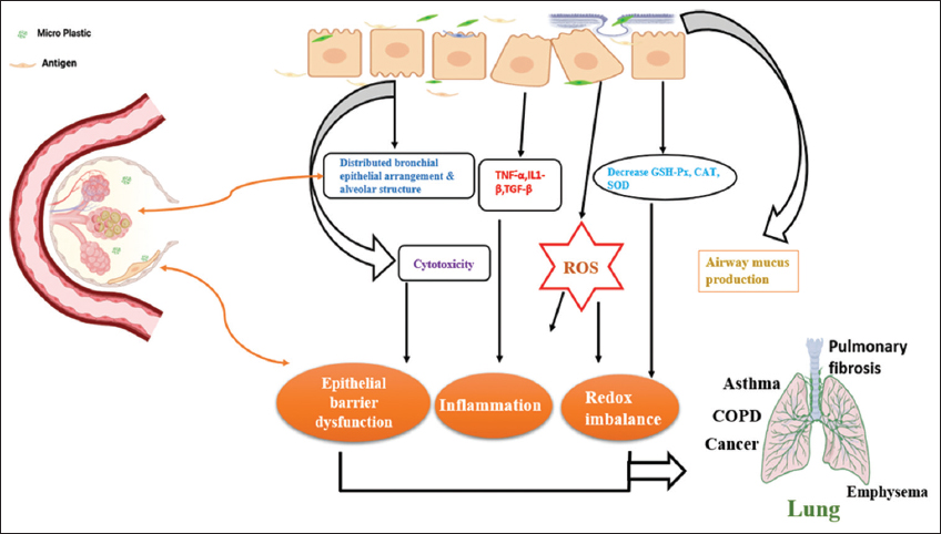 | Figure 2: Mechanisms of microplastics on the respiratory system. [Click here to view] |