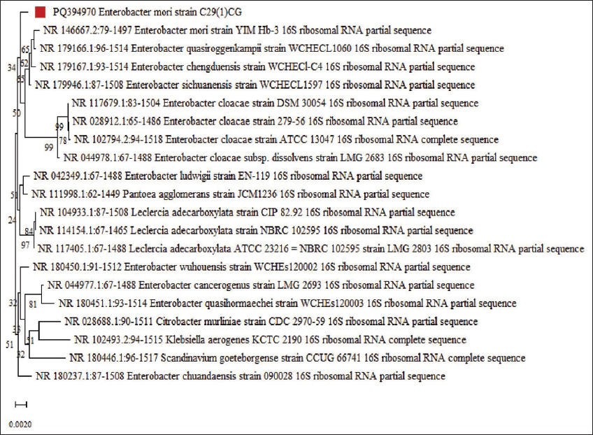 The selected isolated bacteria C29(1)CG were first observed under a light microscope and recorded as Gram-negative, short rods, and motile. The morphology of the bacterial colony was smooth, soft, and white. The phylogenetic position of the bacterial isolate C29(1)CG was determined by analyzing the 16S rRNA gene sequencing and comparing it to closely related E. mori species from the GenBank database. The isolated species was identified as E. mori C29(1)CG (accession no. PQ394970) with a percentage similarity of 99% as shown in Figure 2.