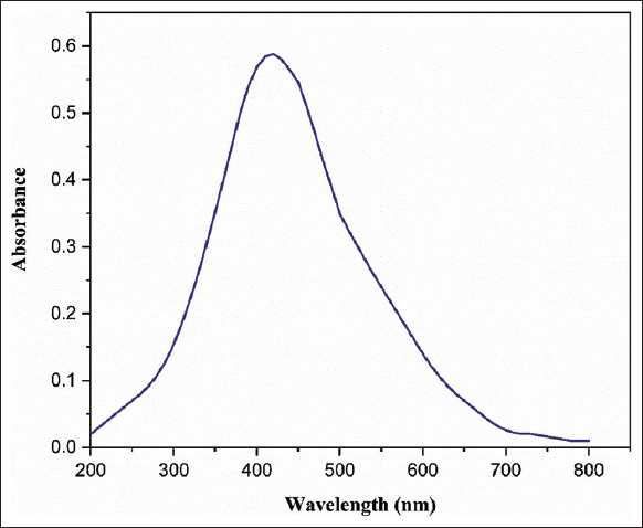 AgNPs synthesized by the cell-free supernatant of C29(1)CG was characterized by UV-Vis spectrophotometer, that conducted the primary assessment of nanoparticles. The color of the AgNP mixture that progressively changed from white to yellowish-brown indicates the formation of biosynthesized AgNPs was then used for spectral analysis. The result revealed that the highest peak for biosynthesized AgNPs was recorded at 410 nm [Figure 3]. This peak is characteristic of AgNPs synthesis and is caused by the excitation of surface plasmon vibrations in the nanoparticles [24]. In contrast, prior research suggested that AgNPs possessed free electrons, creating a surface plasmon resonance at 406, 416, 430, and 448 nm [25-29].