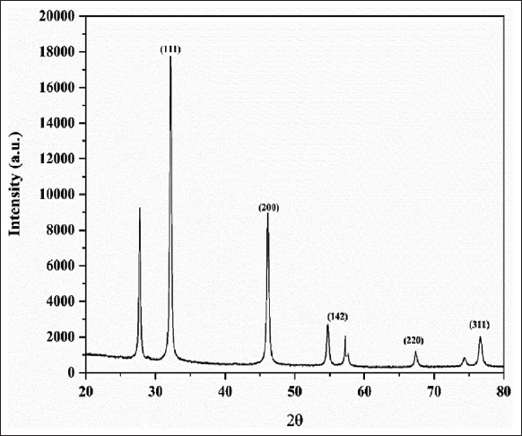 This method is extensively employed to examine the crystalline structure of AgNPs. The XRD analysis facilitated the identification and quantification of the unique crystallographic structure of this substance present in the bacterial extract, together with the particle sizes of the produced AgNPs. The crystalline nature of the biosynthesized AgNPs was shown by their XRD spectra, and the particles’ oxidation state was ascertained over time. The findings showed that AgNPs were present on the nanometric scale. The Debye-Scherrer formula was used to get the average particle size [30]. The dry sample of biosynthesized AgNPs was further characterized by XRD, which confirms its crystalline nature. The XRD analysis represents the Miller-Bravais indices of (111), (200), (142), (220), and (311) as shown in Figure 4. This reveals that the structure of AgNPs is a face-centered cubic structure as per available literature (JCPDS, File No. 4-0783). Similar results were achieved by Fouad et al., and Giri et al. [12,31]. The crystallite sizes of silver in various planes were measured at 34.20 nm, 34.92 nm, and 30.27 nm, with a mean value of 33.13 nm across all peaks.