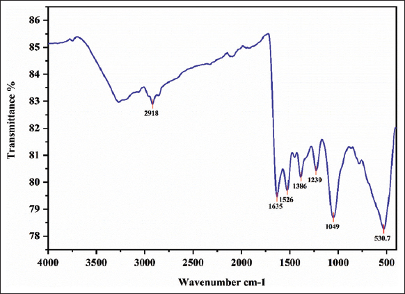 FTIR Spectroscopy is an essential analytical technique in investigating the role of bacterial extract in the reduction and stabilization of AgNPs. In this method, infrared light is utilized to assess the surface chemistry of nanoparticles fabricated by bacterial extract [30]. Infrared spectrum studies were carried out to confirm the functional groups and chemical bonds of the phytochemicals present in the extract using the absorption and transmittance values of infrared radiation. The standard spectra of AgNPs employing cell-free supernatant from C-29(1)CG were shown. The peaks were shown at 2918, 1635, 1526, 1386, 1230, 1049, 530.7 cm−1. Asymmetric stretching of a methyl group - CH3 and C-H stretching of alkanes or secondary amine are responsible for the peak at ~2918 cm-−1. The peak at ~1633.91 cm−1 and 1526 cm−1 is typically associated with amide I (C = O stretching of proteins). Moreover, peak at 1386 and 1230 cm−1 represents the presence of C-N aromatic amino group. Singh and Mijakovic [32] achieved similar outcomes. The (C-O) of an alkoxy group may be responsible for the peaks at 1049 and 530.7 cm−1 indicate C-C deformation as shown in Figure 5 [32,33]. The result of FTIR represents the presence of carboxyl groups (−C = O) and amine groups (NH), which indicate the presence of proteins, amino acids, and other biomolecules extracted from the supernatant of the E. mori C-29(1)CG. These protein molecules act as reducing, capping, and stabilizing agents and are responsible for reducing Ag+ to Ag°0 and attaching to the surface of AgNPs by –NH and C = O groups and preventing their agglomeration [34]. These compounds may enhance hydrogen bonding or electrostatic contact with bacterial membranes, enhancing AgNP adherence and penetration into microbial cells. Furthermore, they regulate redox reactions at the interface between nanoparticles, which increases the production of ROS [35]. Therefore, FTIR spectroscopy is an easy and suitable way to ascertain the role of bacterial extracts in the reduction of AgNPs.