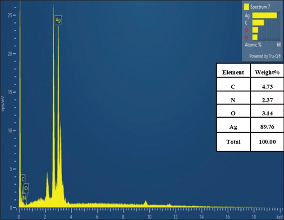 | Figure 7: Energy dispersive X-ray pattern of silver nanoparticles synthesized using cell-free supernatant of Enterobacter mori C-29(1)CG. [Click here to view] |