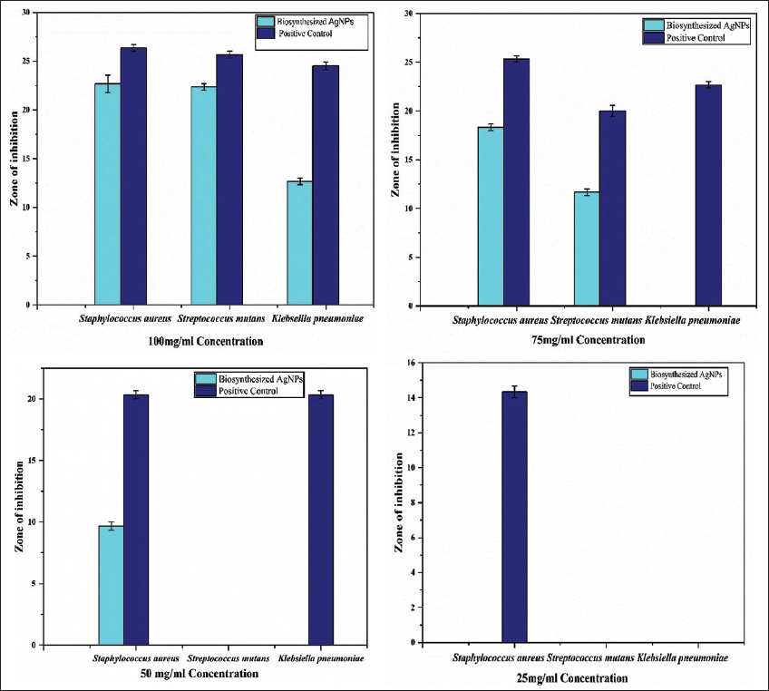 The inhibitory effect of AgNPs was assessed against microorganisms. However, all four different concentrations of biosynthesized AgNPs against test microbes are shown in Table 1 and Figure 8. At a concentration of 100 μg/mL concentration, biosynthesized AgNPs exhibited a significant zone of growth inhibition against S. aureus, S. mutans, and K. pneumoniae in comparison to the control, as shown in Figure 9 and Table 1. Biosynthesized AgNPs showed the zone of inhibition size for S. aureus, S. mutans, and K. pneumoniae was 22.667 ± 0.882, 22.333 ± 0.333, and 12.667 ± 0.333, respectively. Furthermore, the study explains that 75, 50, and 25 μg/mL concentrations of biosynthesized AgNPs have not significantly enhanced the antibacterial activity as shown by 100 μg/mL concentrations against the test microorganisms [Figure 8 and Table 1]. Consequently, it is revealed that a concentration of 100 μg/mL of biosynthesized AgNPs may serve as an effective antibacterial agent against S. aureus followed by S. mutans and K. pneumoniae. Biosynthesized AgNPs was compared to Streptomycin (26.333 ± 0.333 for S. aureus, 25.667 ± 0.333 for S. mutans and 24.5 ± 0.408 for K. pneumoniae) as PC. However, distilled water as a negative control did not show any activity against test microorganisms. Hereby, in case of S. aureus and S. mutans, the present study reveals that the increasing concentration of AgNPs as antibacterial agent increases the zone of inhibition size and hence, increases the antibacterial activity against disease-causing microorganisms. In a similar study, Fouad et al., [12] stated that the increased concentration of AgNPs, gave the highest diameter of inhibition growth against test microorganism. AgNPs exhibits various mechanisms of antimicrobial action against resistant pathogens. The study reveals that biosynthesized AgNPs showed the strongest antibacterial efficacy against S. aureus among the studied pathogens. The Gram-positive cell wall structure of S. aureus has a thick peptidoglycan layer but no outer membrane, is responsible for this greater susceptibility [36]. n addition, S. aureus is well-known for having a large number of membrane-associated proteins, which could facilitate interactions with AgNPs that have been functionalized with proteins. Biosynthesized AgNPs are very efficient against this pathogen because of their ability to increase binding, cause ROS-mediated damage, and disrupt cells [37]. However, Guzman et al., [38] have been reported that the antimicrobial potential of AgNPs was mainly due to the close adhesion of nanoparticle’s surface to microbial cells. It is stated that during the antibacterial impact, silver ion extensively interact with phosphorus and sulfur. These elements are found in abundance across the cell membrane and silver ions exploit these key materials for showing antibacterial ability. Moreover, AgNPs also disrupt membranes and trigger the generation of ROS, producing free radicals with a potent bactericidal activity, ultimately causing microbial cell death [39]. Furthermore, AgNPs disrupt protein activity and damage DNA in bacterial cell. The most generally recorded bactericidal mechanism involves AgNPs interacting with the thiol groups of L-cysteine residues in proteins, resulting in their inactivation. This interaction can denature RNA and DNA by breaking the respiratory chains. The potential of AgNPs to perforate into bacterial cells promotes damage on morphology and structure and results into cell death [3].