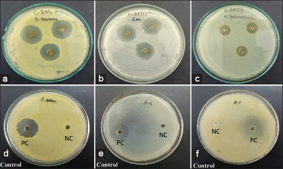 | Figure 9: Effect of AgNPs synthesized using cell-free supernatant of Enterobacter mori C-29(1)CG on (a) Staphylococcus aureus, (b) Streptococcus mutans and (c) Klebsiella pneumoniae showing clear zone of inhibition indicating strong antibacterial action while (d),(e) and (f) shows positive control (PC) and negative control (NC). [Click here to view] |
