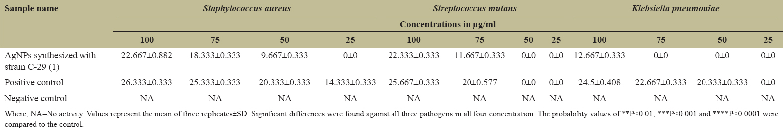 Where, NA=No activity. Values represent the mean of three replicates±SD. Significant differences were found against all three pathogens in all four concentration. The probability values of **P<0.01, ***P<0.001 and ****P<0.0001 were compared to the control.