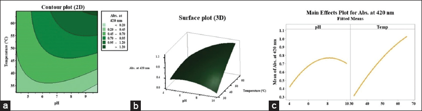 | Figure 2: (a) Contour plot, (b) Surface plot, (c) Response optimization curve for silver nanoparticles production. [Click here to view] |