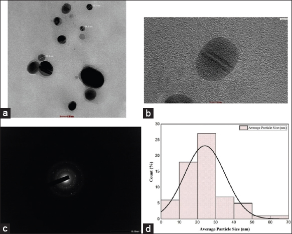 TEM analysis provided detailed insights into the morphology and structure of the synthesized AgNPs. As shown in [Figure 4a and b], the HR-TEM image reveals that the nanoparticles are predominantly spherical. The particle size ranged from 5.05 to 61.4 nm, with an average diameter of 24.03 nm, indicating a well-distributed nanoscale population. These findings are further supported by the particle size distribution histogram [Figure 4d], which illustrates a narrow dispersion with most particles falling within the 10–40 nm range. The selected area electron diffraction pattern [Figure 4c] confirmed the FCC crystalline structure, characteristic of metallic silver. The observed interplanar spacing (~0.23 nm) corresponds to the (111) planes of FCC silver, in agreement with XRD results.