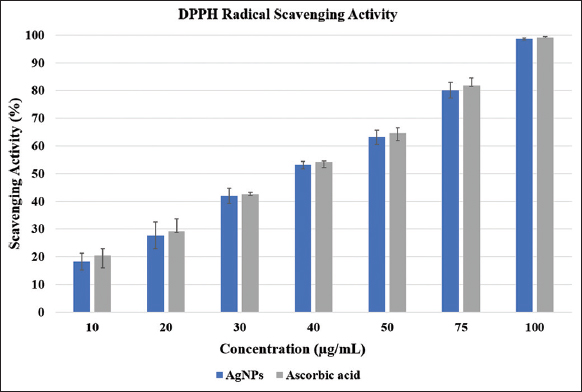 To evaluate the antioxidant potential of the synthesized AgNPs, a DPPH free radical scavenging assay was performed across a range of concentrations. The lowest scavenging activity was observed at 10 μg/mL (18.31 ± 3.02%), while the highest was recorded at 100 μg/mL (98.60 ± 0.37%). Statistical analysis using one-way ANOVA indicated a highly significant, dose-dependent increase in antioxidant activity (P < 0.0001; [Figure 5]). The IC50 value was calculated as 41.09 ± 0.35 μg/mL, highlighting the strong antioxidative efficacy of the biosynthesized AgNPs. Ascorbic acid was taken as the positive control and showed a steady rise in scavenging activity, from 20.44 ± 2.43% at 10 μg/mL to 99.12 ± 0.40% at 100 μg/mL, confirming the reliability of the assay. At higher concentrations, the AgNPs displayed antioxidant activity that was almost comparable to ascorbic acid. These findings are consistent with earlier reports demonstrating concentration-dependent antioxidant responses in AgNPs synthesized from biological sources such as Blighia sapida [28] and Azadirachta indica [29] leaf extracts, as well as marine fungi including Penicillium oxalicum and Fusarium hainanense [6].