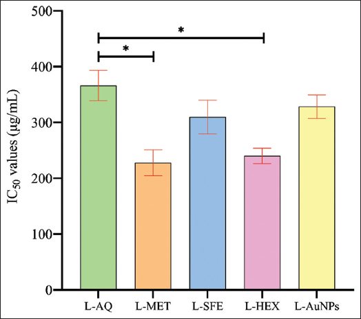 Percent cell viability was assessed using an MTT assay. 3T3-L1 preadipocyte cells were seeded at a density of 1 × 104 cells per well into a 96-well plate and incubated overnight prior to achieving 80% confluency; the cells were treated with different concentrations, namely 50, 100, and 200 µg/mL of leaf extract, and their synthesized Au-NPs for 24 h. Upon treatment, the media were changed with MTT (1 mg/mL), and cells were kept in the dark for 4 h at 37°C. Resulting formazan crystals produced by the metabolically active/functional cells were liquefied in DMSO, and the absorption value was recorded at 570 nm with the help of a microplate reader (Spectra Max M5e, Molecular Devices LLC), according to the previously described method [37]. The cytotoxicity values of the tested compounds and nanoparticles are determined using the formula: