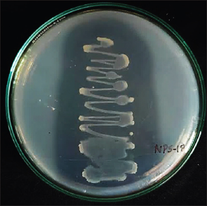 | Figure 2: Isolate NPS-18 showing clear zone when grown on modified Sperber’s medium. This is an evidence for phosphate solubilizing property of the isolate. [Click here to view] |