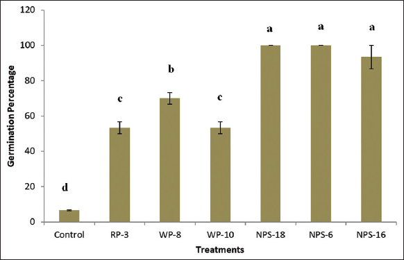 | Figure 3: Effect of Pseudomonas spp. on green gram seed germination. Letters designates significant differences among values (P ≤ 0.05). Treatment with the same letters is not significantly different. Values are means ± SD (n = 3). [Click here to view] |