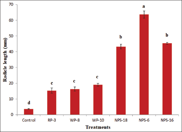 Furthermore, radicle growth from the germinated seeds (after 17 h of incubation) was significantly influenced by the bacterial treatments [Figure 4]. Seeds inoculated with NPS-6 exhibited the highest radicle length (63.63 ± 2.31 mm), which was significantly superior to all other treatments. The strains NPS-16 and NPS-18 resulted in the radicle lengths of 45.30 ± 0.60 mm and 43.30 ± 1.57 mm, respectively, and were statistically at par with each other, ranking next best to NPS-6. The uninoculated control recorded the minimum radicle length (3.60 ± 0.26 mm) compared to all the other treatments. The increased radicle length in these treatments may be attributed to the synthesis and release of phytohormones by Pseudomonas strains, which enhance root elongation through cell expansion and division [40]. The results of this study align with those of several reports emphasizing the beneficial effects of PGPR on seed germination and root development [41,42].