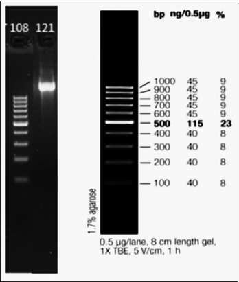 | Figure 6: Agarose gel electrophoresis of polymerase chain reaction amplified 16S rRNA gene region. Lane 108: 1kb DNA ladder used as molecular weight marker, Lane 121: Amplified 16s rRNA gene product (approximately 1000 bp) from isolate NPS-18. [Click here to view] |