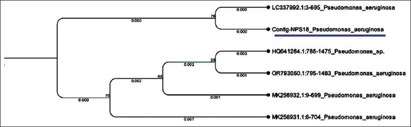 | Figure 8: Phylogenetic tree based on 16S rRNA sequence. The analysis indicates that isolate NPS-18 clusters closely with other strains of Pseudomonas aeruginosa. [Click here to view] |