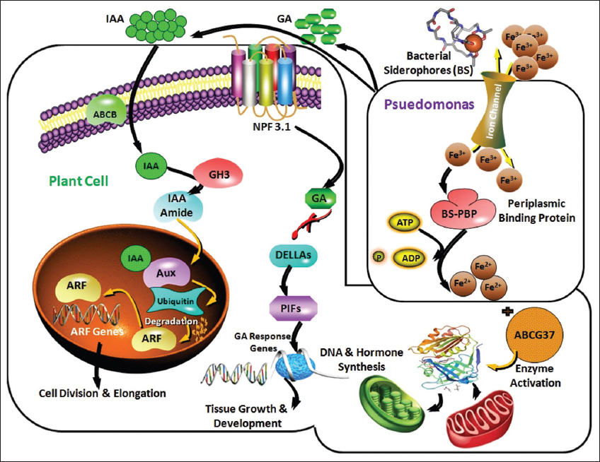Finally, we hypothesized that [Figure 9] the Pseudomonas strain NPS-18 isolated in this study enhances plant growth by producing siderophores and phytohormones (IAA and GA). IAA produced by the isolate is transported to the root hair cells via ATP-binding cassette transporters, resulting in elevated intracellular IAA levels. This may lead to the ubiquitination and subsequent degradation of the Aux/IAA repressor protein [62]. This process activates auxin-responsive genes, prompting growth and development of the plant. In addition, GA produced by the isolates binds to the gibberellin insensitive dwarf (GID 1) receptors located on the root hair cell membrane, forming the GA-GID 1 complex. This complex interacts with the TVHYNP motif of the DELLA protein. As a result, the DELLA protein undergoes ubiquitylation and is consequently degraded via the 26S proteasome pathway, activating PIF transcription factors. Furthermore, the process induces GA-responsive genes [63], thereby promoting tissue growth and development. Similarly, siderophores (BSP) produced by bacterial strains chelate Fe3+ ions present in the soil. Successively, they are transported to plant root hair cells via ABCG37 transporters [64]. The enhanced intracellular availability of iron boosts the activity of iron-dependent enzymes involved in phytohormone biosynthesis, DNA replication, photosynthesis, and respiration, culminating in plant growth.