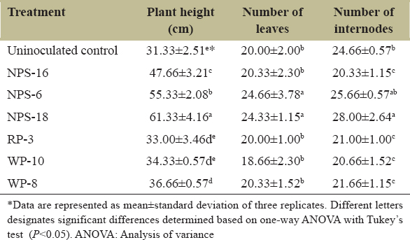 The effect of Pseudomonas isolates on jasmine growth was evaluated using a pot culture experiment. Compared with the uninoculated control, treatment with Pseudomonas significantly enhanced plant growth [Table 4 and Figure 5]. NPS-18 demonstrated outstanding improvement in plant growth, recording a significantly greater plant height (61.33 ± 4.16 cm) and number of internodes (28.00 ± 2.64) compared to all the other treatments, including control. This accounted for an increase of 95.8% and 13.94% compared to plant height and number of internodes, respectively, relative to the control [Table 4]. Treatments with NPS-6 and NPS-18 recorded the highest number of leaves of 24.66 ± 3.78 and 24.33, respectively, which are significantly higher than the uninoculated control (20.00 ± 2.00).