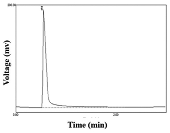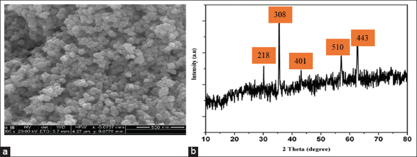 The XRD pattern [Figure 2b] displays distinct peaks with corresponding 2θ values and Miller indices suggesting the crystalline nature of the NPs. The notable peaks at 218, 220, and 308 corresponds to plane, which are characteristic of spinel-type cubic ferrite structures, especially magnetite (Fe3O4) or maghemite (γ-Fe2O3), confirming magnetic iron oxide NPs [16,21]. The sharpness and intensity of the peaks indicate good crystallinity. So also, the most intense peak at 311 at an angle theta ~35.8° typically indicates the presence of magnetite [22].