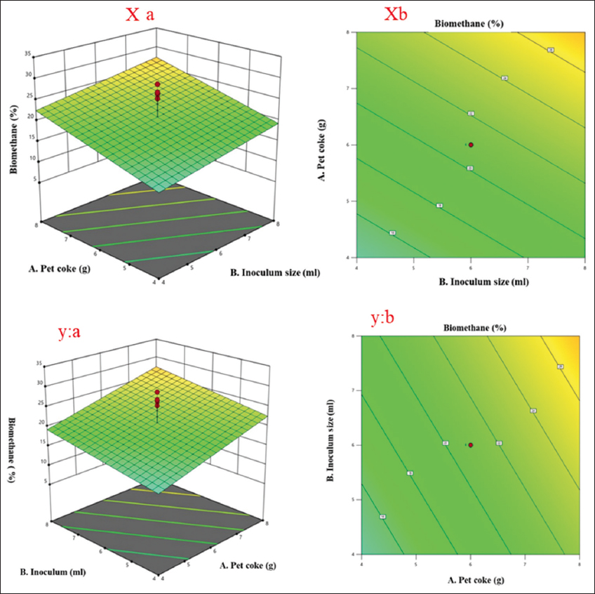 RSM is a widely applied statistical and mathematical approach used to model and optimize processes influenced by multiple variables [23]. Its primary objective is to determine the optimal conditions that maximize or minimize a desired response. In this context, the variables that influence the process are referred to as independent variables, whereas the outcomes or results are termed dependent variables [24]. For instance, biomethane yield (response) may be influenced by variables, such as X1 (biomass concentration) and X2 (inoculum size), with the yield varying across different combinations of these variables. The selection of independent variables and their respective limits is typically based on previous experimental studies or literature. In RSM, the experimental data are fitted to appropriate statistical models, which may include linear, quadratic, cubic, or two-factor interaction (2FI) models [14]. The model coefficients comprise a constant term, linear coefficients (A, B, C), interaction coefficients (AB, AC, BC), and quadratic coefficients (A2, B2, C2). The highest biomethane yield was obtained at a feedstock concentration of 8 g/L pet coke, with 8% (v/v) inoculum and 40 mg/L of magnetic iron oxide NPs. Under these conditions, the predicted biomethane yield was 33.2%, whereas the observed yield was 32.1%. Paired T-test confirmed no statistically significant difference between the two (P = 0.158).