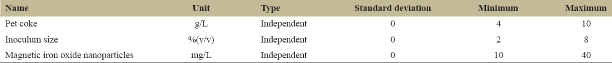 | Magnetic iron oxide nanoparticles | mg/L | Independent | 0 | 10 | 40 |