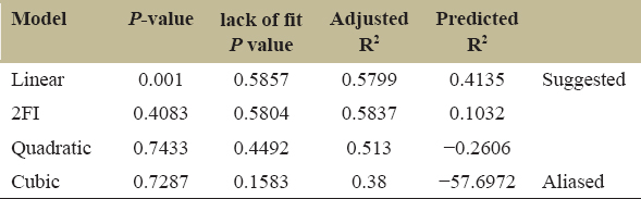 | Model | P-value | lack of fit P value | Adjusted R2 | Predicted R2 | |