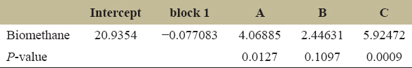 The regression coefficient analysis is presented in Table 6 revealing C (Fe2O3) factor had the most significant influence on biomethane yield with a coefficient of 5.92 and a P = 0.0009, respectively. Both factors showed a positive and statistically significant effect, indicating that increasing these parameters enhances biomethane production during the AD of pet coke. However, factor B exhibited a positive but statistically insignificant effect P = 0.1097, implying that its individual contribution to the response may be limited or dependent on interaction with other variables.