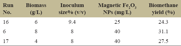 | Run No. | Biomass (g/L) | Inoculum size% (v/v) | Magnetic Fe2O3 NPs (mg/L) | Biomethane yield (%) |