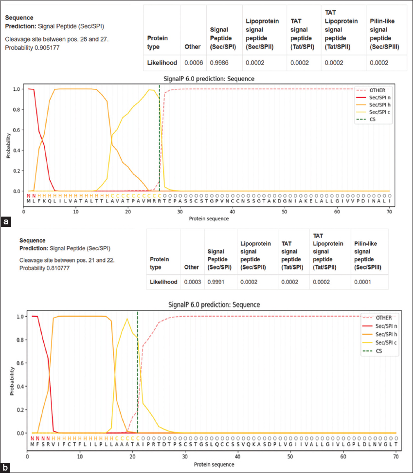 | Figure 2: (a) Signal peptide prediction of Hydph6. (b) Signal Peptide prediction of Hydph7.