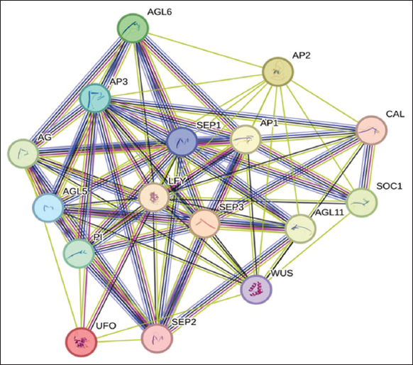 | Figure 2: Protein–protein interaction networks of the 32 putative floral homeotic genes deciphered by the STRING online tool. Network nodes (bold circles) represent proteins. Edges (lines) show protein-protein association. The black coloured lines indicate actual interaction between proteins connecting one node to another. PPI enrichment with P: <1.0e-16. [Click here to view] |