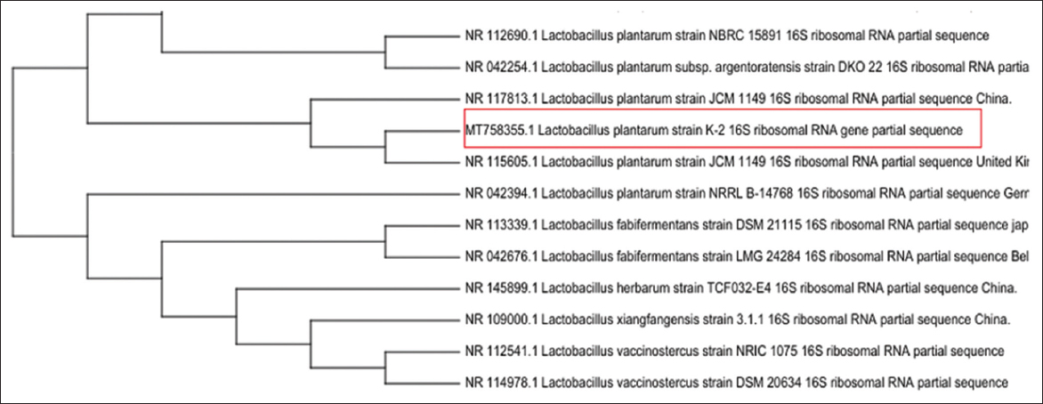 The stained cells of LAB had the shape of a rod, without spores, when examined under a microscope, and were also determined to be Gram-positive. Other characteristics, including the nature of carbohydrate fermentation (data not shown here), suggested that the strain belongs to the genus L. plantarum species. L. plantarum K-2 16S rRNA gene amplified using universal primers and the nucleotides were sequenced. The resulting 16S rRNA nucleotide sequence was compared with that in the NCBI reference database using BLAST algorithms, and the 16S rRNA sequence of L. plantarum showed 99% similarity. Our isolate highlighted in red is MT753855.1 (L. plantarum strain K-2), which is located in the same group as other L. plantarum strains, in particular JCM 1149 (China and Great Britain).The upper cluster of the tree shows strains related to the L. plantarum species, while the lower branches contain representatives of Lactobacillus fabifermentans, L. herbarium, L. xiangfangensis, and other species. The results of this phylogenetic analysis indicate that our isolate has a close genetic relationship to the L. plantarum species. The phylogenetic tree was constructed using the algorithm of combining neighbors in the MegaX program [Figure 1]. The obtained results confirm the molecular identification of the isolate and scientifically substantiate its inclusion in the L. plantarum group.