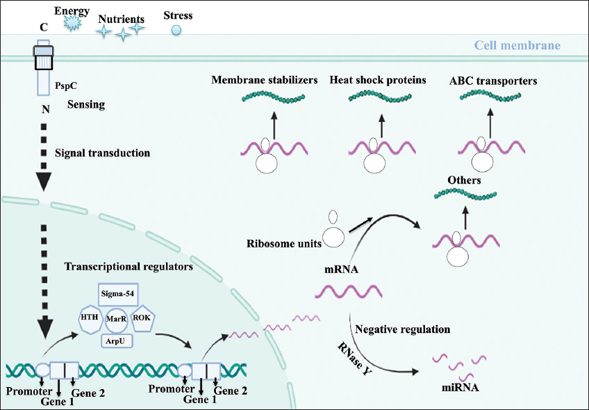 The sigma factor of RNA polymerase (CCPI-G49) is a transcription initiation factor that enables specific binding of RNA polymerase (RNAP) to gene promoters needed to initiate transcription in bacteria. The specific sigma factor used to activate transcription of a given gene will vary, depending on the gene and the environmental signals. RNAP factor sigma-54 is needed to initiate transcription in bacteria in a nitrogen-limited environment [27,28]. The protein PspF also activates the σ54-dependent transcription of the pspABCDE operon [26]. The sigma-54 transcriptional regulator and its interacting counterpart, the Sigma-54-interacting transcriptional regulator (CCPI-G51), add specificity to this response. This helps to focus on genes that help the bacterium function optimally in low-oxygen conditions [Figure 4] [29]. The sigma-54 transcriptional regulator is known for flagellar biosynthesis, motility [30-34], amino acid metabolism [35-37], quorum sensing, biofilm formation, virulence [38-40], and bacterial natural product genes [41].