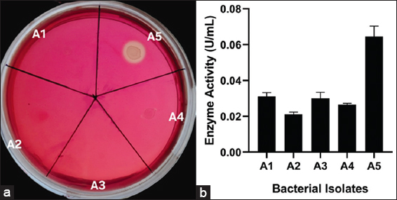 Five bacterial isolates were selected on the basis of morphological differences after spreading the B. indicus feces sample on CMC-BH agar plates. Out of these five isolates, only isolate A5 demonstrated a visible hydrolytic zone after staining with 0.3% Congo red solution [Figure 1a]. All isolates were also investigated quantitatively, and isolate A5 demonstrated notable initial CMCase activity (0.064 ± 0.0045 U/mL) after 72 h of incubation at 37°C [Figure 1b]. The initial CMCase activity of isolate A5 was comparable with some other known cellulolytic producing strains isolated from various environments, which include Cellulomonas spp. (0.033 U/mL) [36], Micrococcus spp. (0.015 U/mL) [36], Brevibacillus spp. JXL (0.02 U/mL) [37], Geobacillus spp. (0.012 U/mL) [38], Pseudomonas spp. NE (0.061 U/mL) [32] and Bacillus subtilis AS3 (0.07 U/mL) [39].
