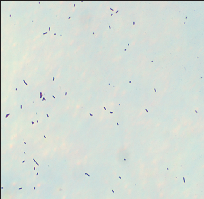 Selected bacterial strain A5 was subjected to cultural characterization, such as size, shape, and pigmentation. Microscopic examination under an oil immersion lens (×100) revealed that bacterial isolate A5 was Gram-positive rod-shaped in nature [Figure 2]. According to biochemical characterization, isolate A5 indicated negative results for the indole, starch hydrolysis, and nitrate reduction tests, while yielding positive results for the VP, methyl red, oxidase, catalase, and citrate utilization tests. In the case of the TSI test, the color of the butt and slant remained orange with no H2S production [Table 1]. Similar biochemical profiles were reported by Parvathi et al. [40] and Kapilan and Arasaratnam [41] for B. pumilus. These morpho-biochemical characteristics, together with a comparison with the Bergey’s manual of systematic bacteriology, imply that isolate A5 is most likely B. pumilus.