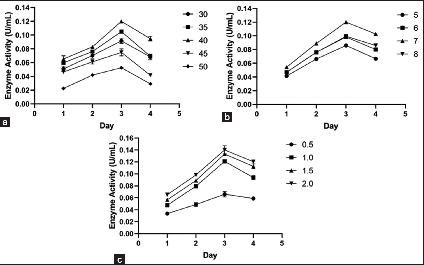 Cellulase activity was affected by temperature, and to study this, the crude enzyme was incubated at a range of temperatures from 30°C to 50°C. Enzyme activity of B. pumilus increased steadily while reaching its peak at 40°C, before declining [Figure 5a]. These findings are similar to those of Mokale Kognou et al. [31], who identified 40°C as the optimal temperature for cellulase production by the MKAL2 strain isolated from soil. Similarly, Bacillus pseudomycoides, isolated from sugarcane bagasse, exhibited maximum enzyme activity at 40°C and pH 7.0 after 72 h of incubation [51]. Streptomyces ruber, sourced from decaying biomass, also demonstrated peak cellulase activity at 40°C [52].