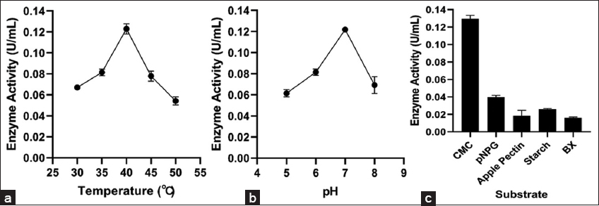 Experiments were conducted within a pH range of 5.0–8.0 to assess the impact of pH on crude enzyme activity. The crude extract of the bacterial strain demonstrated optimum enzyme activity at pH 7.0 [Figure 5b]. The crude extract of B. subtilis A5 showed the highest CMCase activity at 40°C and pH 7.0, which is comparable with the findings of Paenibacillus spp. isolated from molasses-contaminated soil in the sugar sector [44]. Similarly, B. pumilus EB3, isolated from pretreatment oil palm empty fruit bunches, had maximum CMCase activity at pH 7.0 [53].