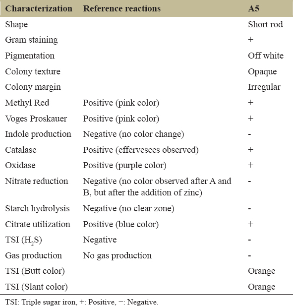 Table 1: Morphological and biochemical characterization of B. pumilus A5 isolated from the feces of a cow.