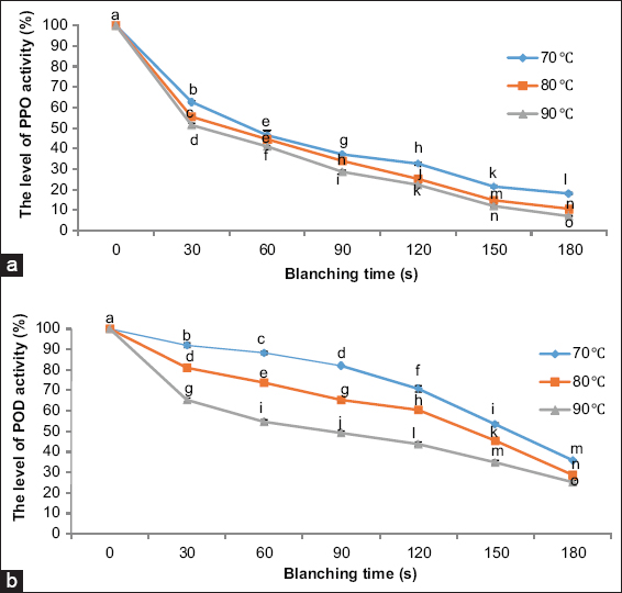 The results [Figure 2] showed that PPO activity was significantly reduced following blanching at all temperature-time combinations. At 70°C for 30 s, PPO activity decreased by 37%, and this reduction progressed with increased temperature and time, reaching up to 93% inactivation at 90°C for 180 s. This pattern is consistent with previous studies indicating that PPO is thermolabile, with optimal activity at 30–40°C and rapid deactivation at higher temperatures [24,25].