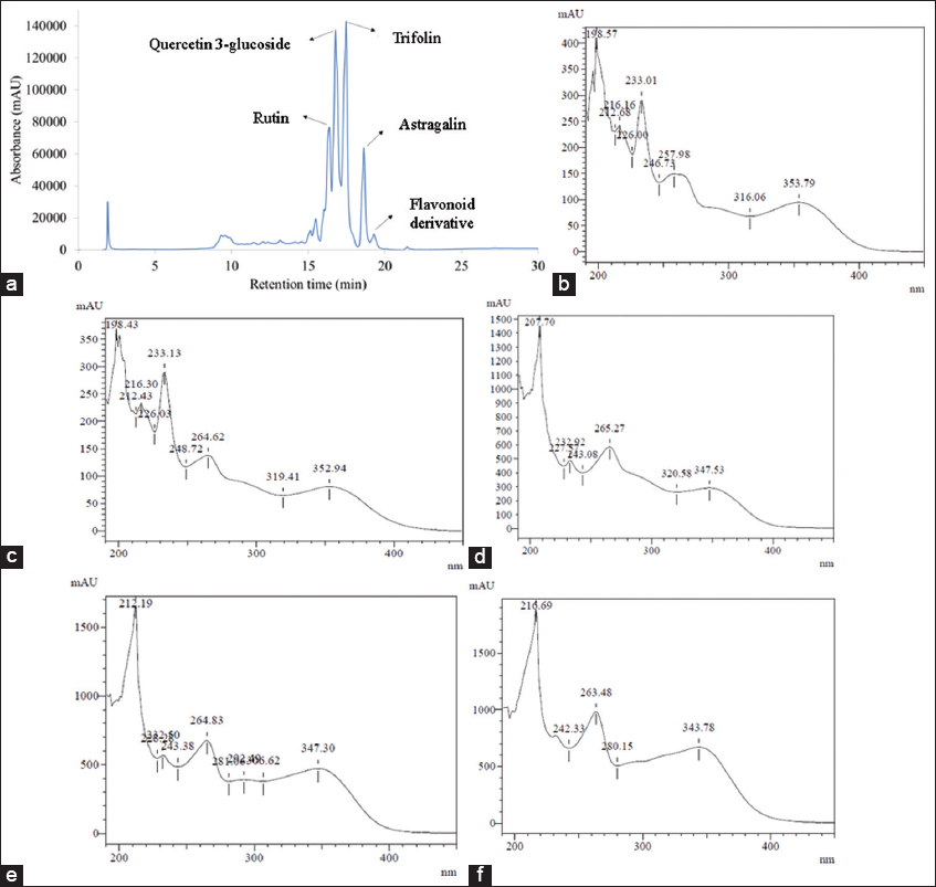 The individual phenolic compounds were identified using HPLC-DAD by matching each compound’s UV-Vis spectra and retention times with the standards. Five compounds were detected as rutin, quercetin 3-glucoside, trifolin, astragalin, and flavonoid derivative. Figure 3 shows the HPLC chromatogram of senggani extracts at 260 nm [Figure 3a] and the UV-Vis spectra of the five flavonoid compounds. UV-Vis spectra of rutin and quercetin 3-glucoside [Figure 3b and c] were obtained by matching the standards with the samples. Trifolin and astragalin [Figure 3d and 3e] were determined by matching the UV-Vis spectra obtained with the UV-Vis spectra in the study by Noh et al. [19]. This identification was corroborated by high-resolution mass spectrometry profiling of M. malabathricum (senggani) flower extracts, as documented in our prior study [4]. The last compound exhibited a UV-Vis spectral pattern similar to that of typical flavonoid compounds; however, its exact structure has not yet been identified and was therefore designated as a tentatively identified flavonoid derivative [Figure 3f].