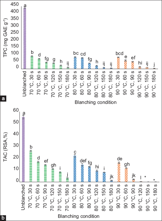 Figure 4: Changes in (a) total phenolic content (TPC) and (b) total antioxidant capacity (TAC) of Melastoma malabathricum (purple senggani) flowers after water blanching at 70, 80, and 90°C for 30–180 s. Different lowercase letters (a-l) above the bars indicate statistically significant differences (P < 0.05) based on Tukey’s honestly significant difference post hoc test. Error bars represent standard deviations. Values below the limit of detection (LOD) are marked with an asterisk (*).