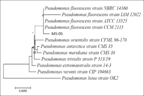 Antagonistically active bacterial strain MS-05 was screened further on various basic tests among all other seven strains. The strain was Gram-negative and rod-shaped, which shows positive oxidase and catalase tests with fluorescent property under UV light. Further, in 16s rRNA sequencing (Sanger method) strain was showing 99% similarities with Pseudomonas [23]. Moreover, a comparative study with the available database on NCBI and the phylogenetic analysis [Figure 1] of that strain MS-05 shows the direct relation with P. fluorescens. Further, the sequence was submitted to the NCBI database with Accession No: PP501522.1.