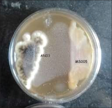 | Figure 2: Dual culture assay Aspergillus niger versus Pseudomonas fluorescens MS-05. [Click here to view] |