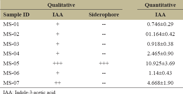 Table 2: Qualitative analysis of isolates for PGP activity (+) week (++) moderate and (+++) high and (--) negative results, IAA (indole-3-acetic acid).