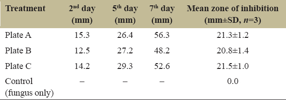 | Treatment | 2nd day (mm) | 5th day (mm) | 7th day (mm) | Mean zone of inhibition (mm±SD, n=3) |