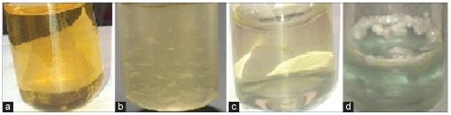 | Figure 1: Qualitative screening for L-asparaginase production by Streptomyces sp. The broth shows change in color of modified M9 media from yellow to blue due to the production of L-asparaginase. (a) M-9 media containing both L-asparagine and bromothymol blue (BTB) pH indicator without inoculum, (b) control tube containing M-9 media without BTB pH indicator, (c) control tube containing M-9 media without L-asparagine, (d) M-9 media containing L-asparagine, BTB pH indicator, and inoculum. [Click here to view] |